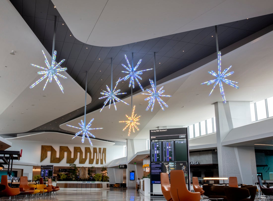 This work is inspired by the seven major stars of Orion, one of the most recognizable constellations in the night sky. Orion is comprised of the stars Alnilam, Alnitak, Bellatrix, Betelgeuse, Mintaka, Rigel, and Saiph. The artist affixes colored filters on LED light tubes to represent the spectral color emission of each star. For example, Betelgeuse is a very old star and appears red in the night sky. The younger stars appear blue. Alnitak and Mintaka’s spectral “fingerprint” are similar and look almost identically blue. The position of the star sculptures in the installation roughly correlates to their position vis-à-vis one another in the night sky.