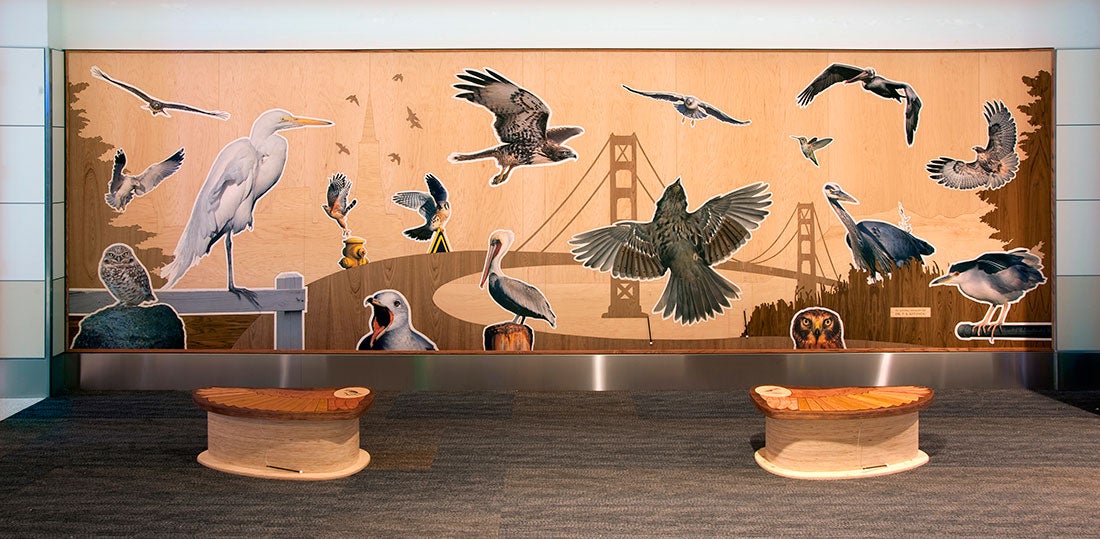 Walter Kitundu created a group of interactive artworks that were designed to offer travelers of all ages a playful oasis. Using high-quality veneer plywood, which he then hand-stained, Kitundu created two benches shaped like bird wings that double as musical instruments. Serving as the backdrop for these musical benches, is a mural made of inlaid wood featuring local birds such as Red-tailed Hawks, Anna’s Hummingbirds, herons, egrets, Northern Harriers, and Burrowing Owls. The birds, which are printed on wood and also inlaid, are derived from photographs that the artist took in San Francisco.