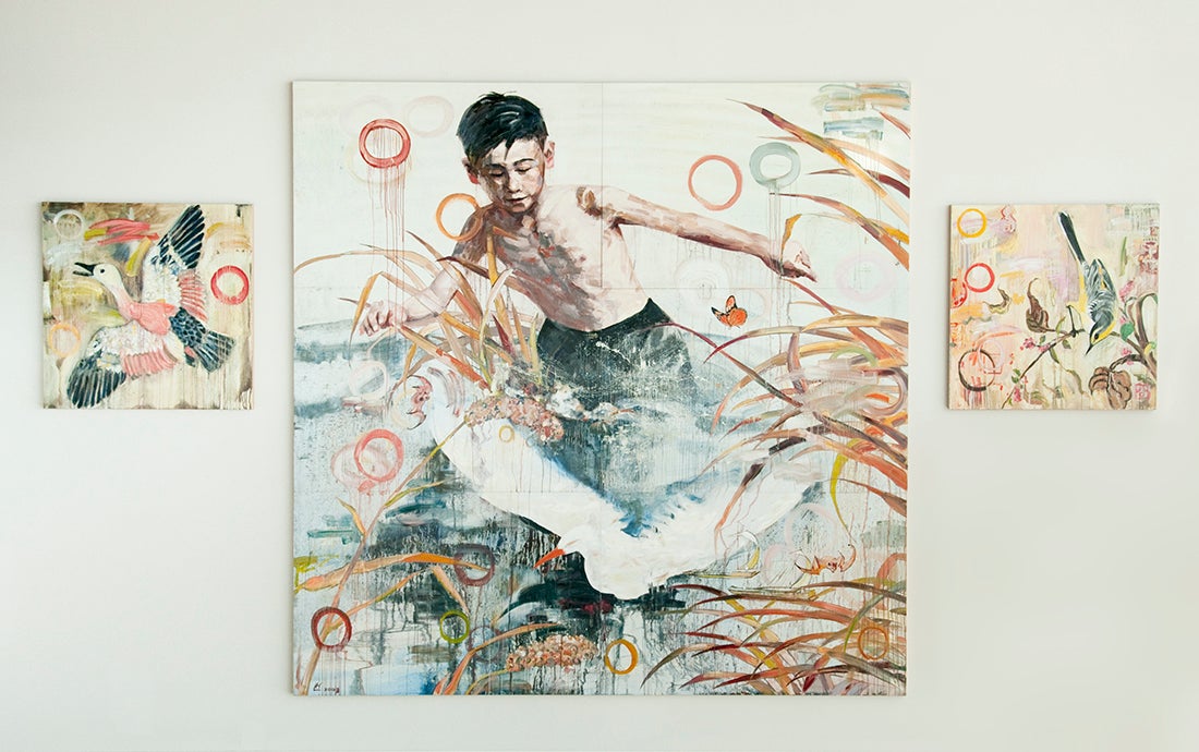 Hung Liu was a Bay Area artist whose signature painterly style is one that allows the paint to drip across the image. In this work, the boy’s outstretched arms mirror the startled bird’s spreading wings, making it a metaphor for the ancient human aspiration towards flight. Like wings themselves, the two smaller panels depict birds from the Song Dynasty, one taking off, and one perched. From ancient times, Chinese artists have depicted birds in paintings and poetry because they represent messengers from the past who convey blessings on the present, and thus upon our own winged journey today.