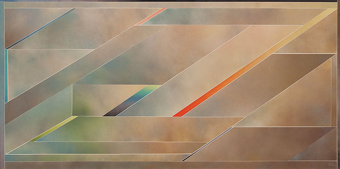 This tightly organized composition of oblique geometric shapes creates an illusion of three-dimensional space on a two-dimensional surface.