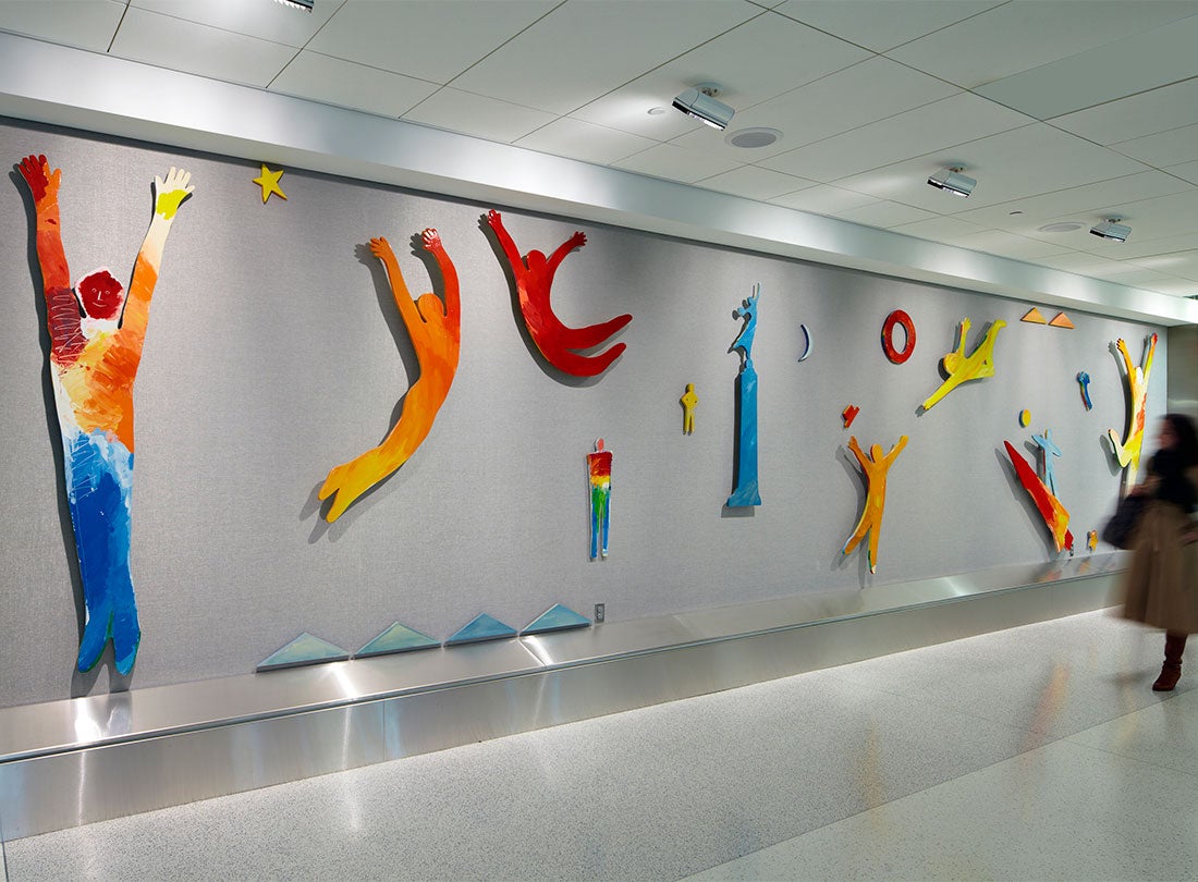 A series of exuberant, waving figures and depictions of San Francisco landmarks highlight the wall piece, designed to greet and welcome visitors from around the world.