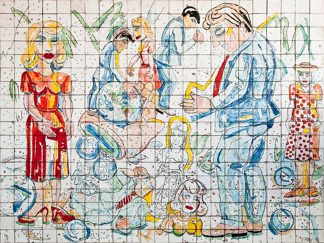 Viola Frey has created a vocabulary of figures and objects that form a personal mythology. For instance, the suited businessman is a symbol of mainstream respectability, often contrasted with bold, vividly dressed women. The grandmother figure is a maternal icon of power inspired by the “take charge” matriarchs in her hometown during World War II. The workman’s glove holds the world in its palm - a statement about the value of work and creativity.
